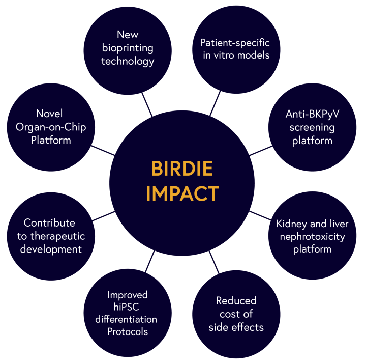 The overall objective of BIRDIE is to build a complex model of human renal tubule-on-chip recapitulating tubular functions. The release of a fully characterized and clinically relevant model of BKPyV infection in vitro will pave the way to new specific antivirals. The organoid technology enables personalized medicine approaches in BIRDIE either using patients own cells or CRISPR-edited cells lines to mimic mutations responsible for renal genetic diseases. This opens avenues for disease modelling and screening for relevant cures.